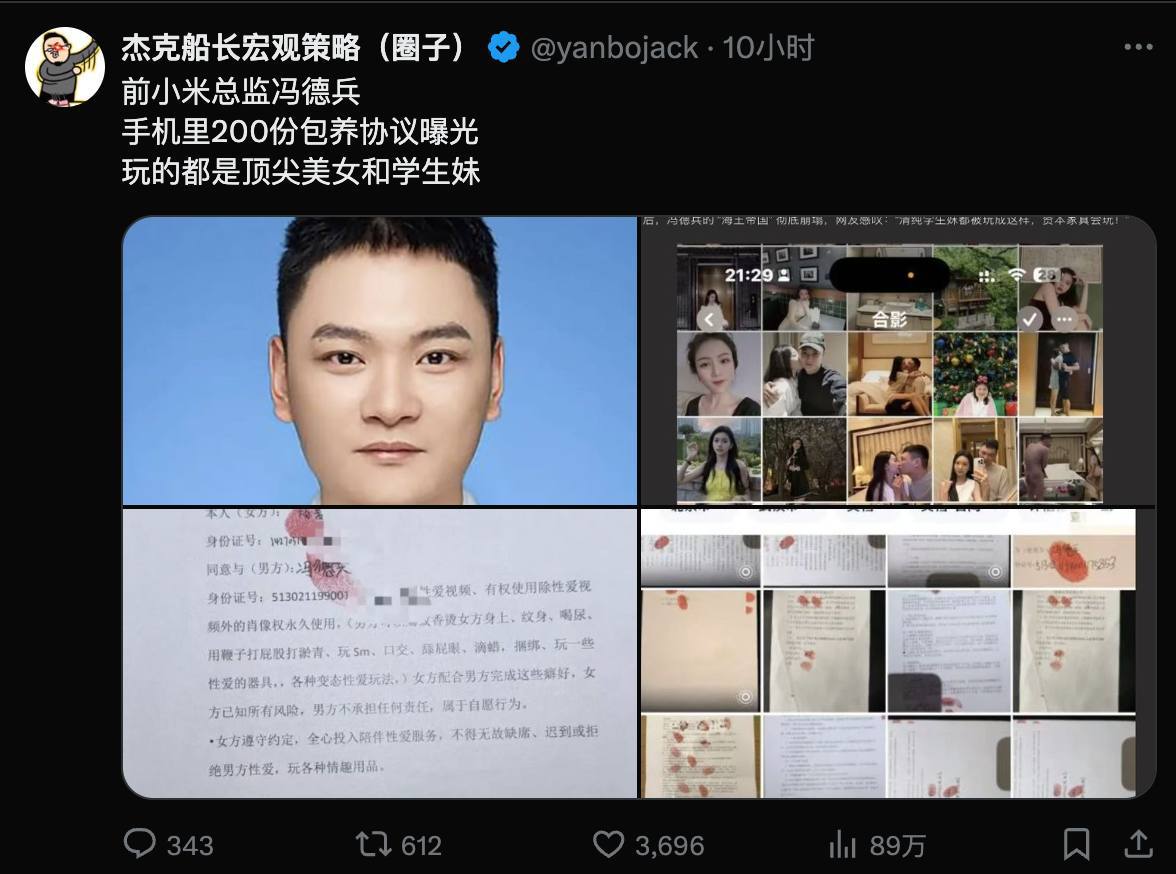超级富哥前小米总监四川达州冯德兵 婚内出轨包养两百多位美女 种种恶行被老婆怒曝大量视频